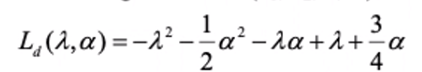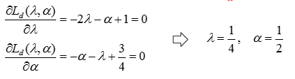 동일하게 x2에 대해서도 미분을 하면 x2 = 람다 + 알파 라는 것을 알 수 있습니다. 결론적으로는 아래와 같은 dual function 이 나오게 됩니다.