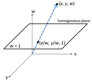 이를 통해서 w라는 homogeneous plane 이라는 평면 위에 Projection을 해서 이 값들을 w 에 해당하는 값들로 나눠 주면 해당되면 새로운 x',y' 를 구할 수 있습니다. 여기서는 w = 1 입니다.