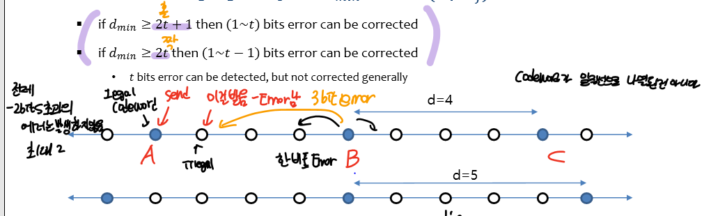 밑에 선에선 3 bit 이상의 에러가 나면 B,C 중에 어느 곳에서 에러가 났는지 알 수 없다.