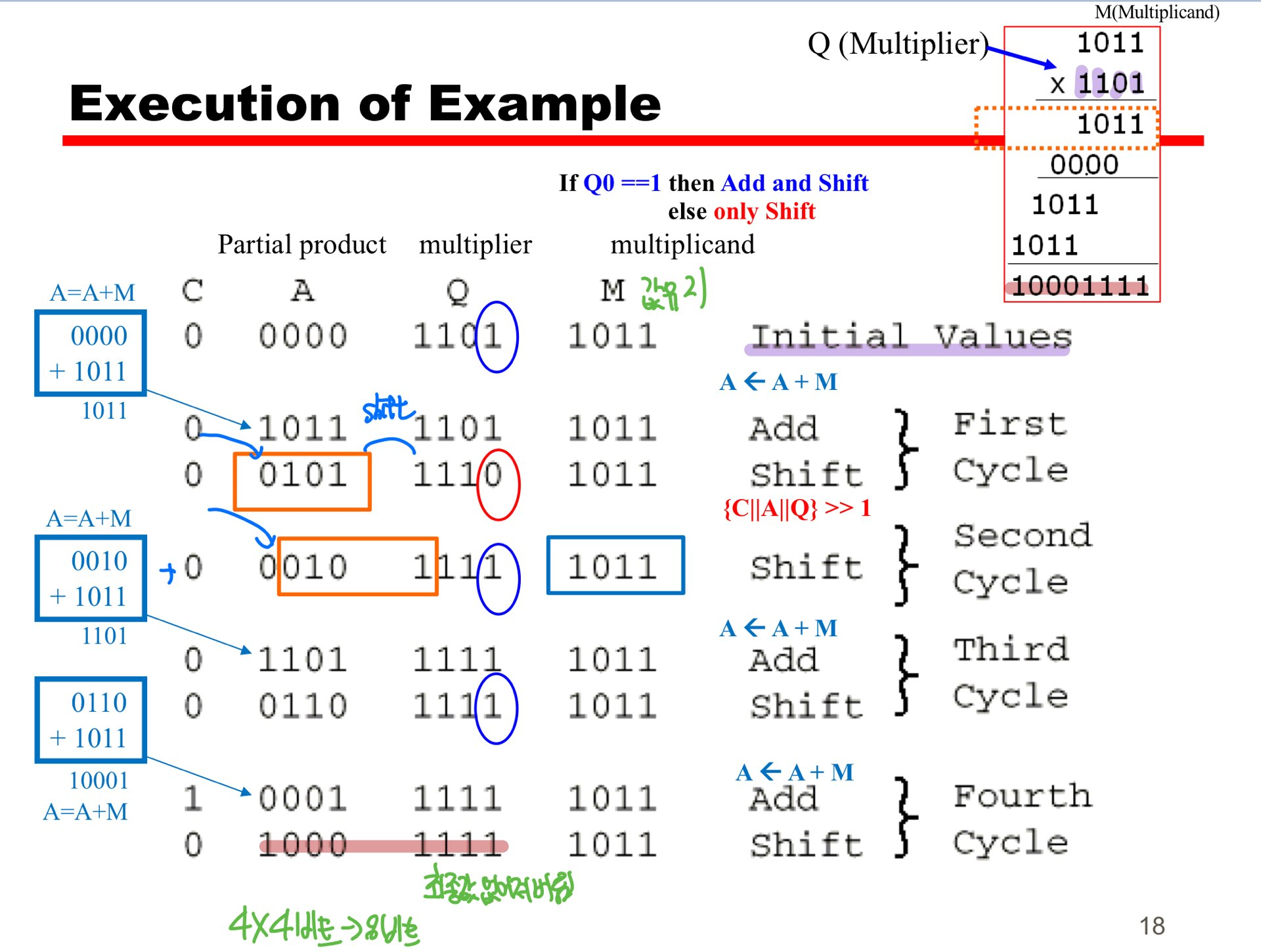 Multiplicand 의 값은 유지가 됩니다. 하지만 Multiplier는 연산후 사라져버립니다. 이를 보면 매우 효율적인 연산 방식임을 알 수 있습니다.