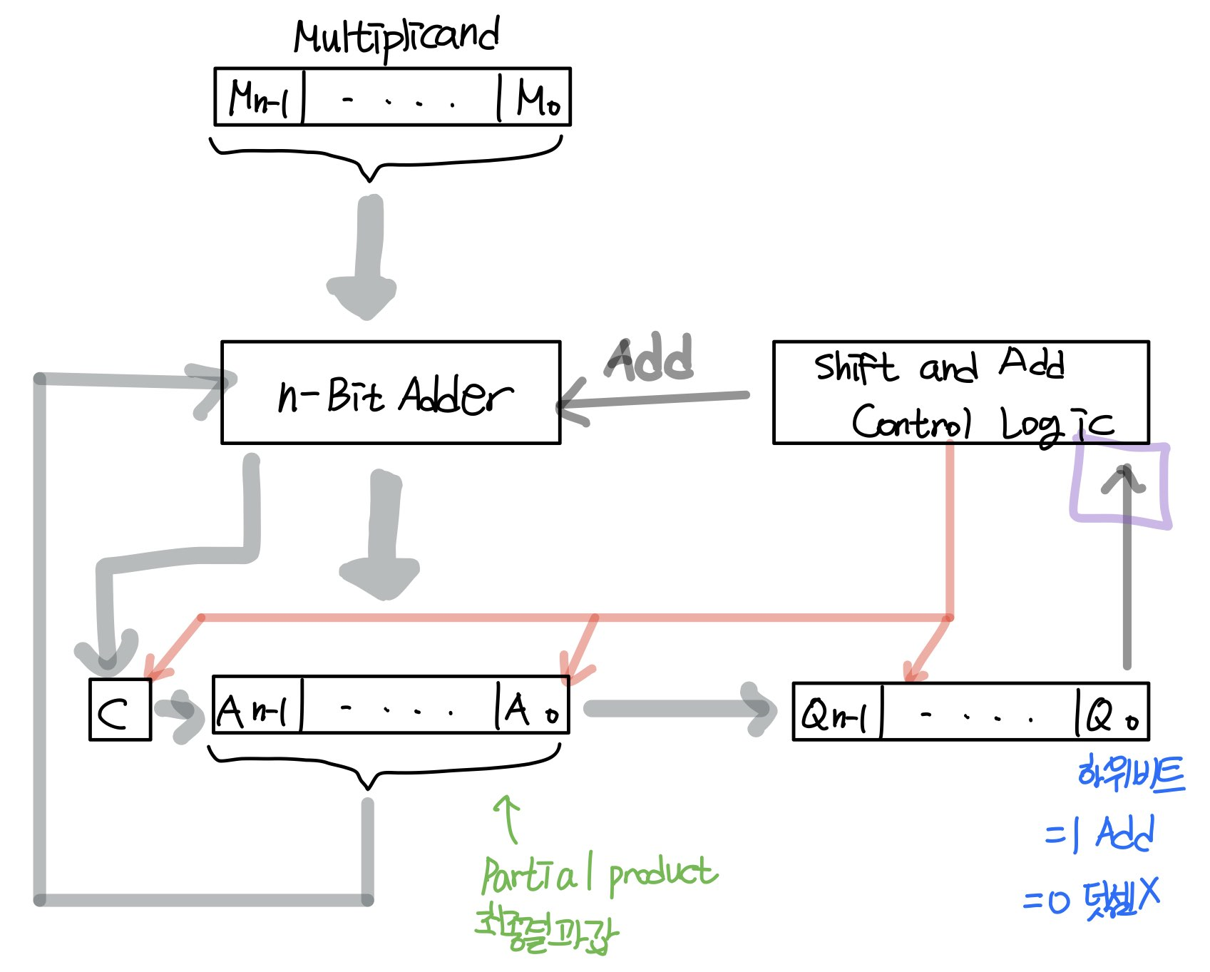 보면 Shift and Add Control Logic이 Multiplier 의 하위비트를 확인하고 Add의 여부를 결정하게 됩니다.