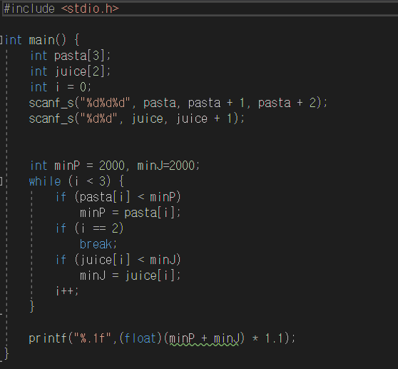 어느 날의 파스타와 생과일 쥬스의 가격이 주어 졌을 때, 그 날 세트 메뉴의 대금의 최소값을 구하는 프로그램을 작성하라.