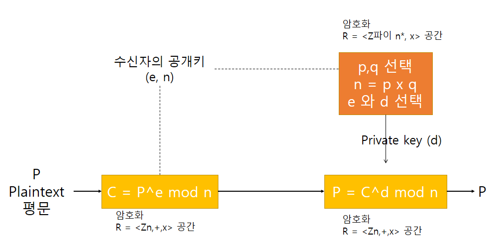평문은 집어넣는거 부터 생각을 해보겠습니다. 평문 P가 C로 암호화가 됩니다. 이때 수신자의 공개키와 n을 이용해 암호화를 합니다. 암호문 Cipher text 를 보냅니다. 그럼 수신자는 자신의 비밀키를 통해서 암호문을 복호화시킵니다.